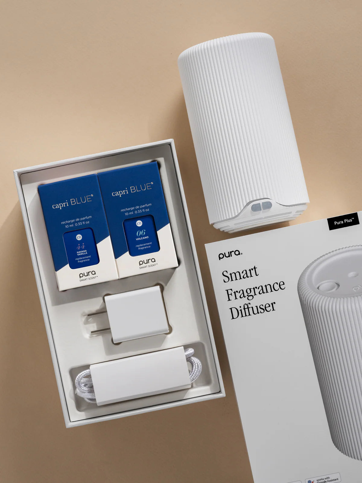 This set includes two premium Capri Blue scents, Volcano and Havana Vanilla, and a Pura Plus™ smart fragrance diffuser.