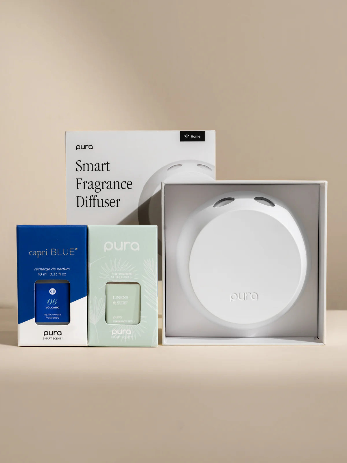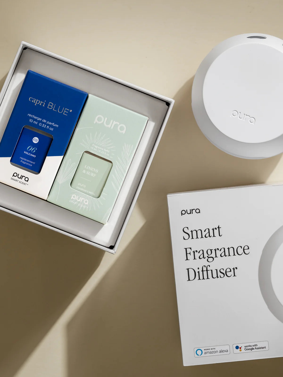 This set includes two signature scents, Capri Blue’s Volcano and Pura’s Linens & Surf, and a Pura 4 smart fragrance diffuser.