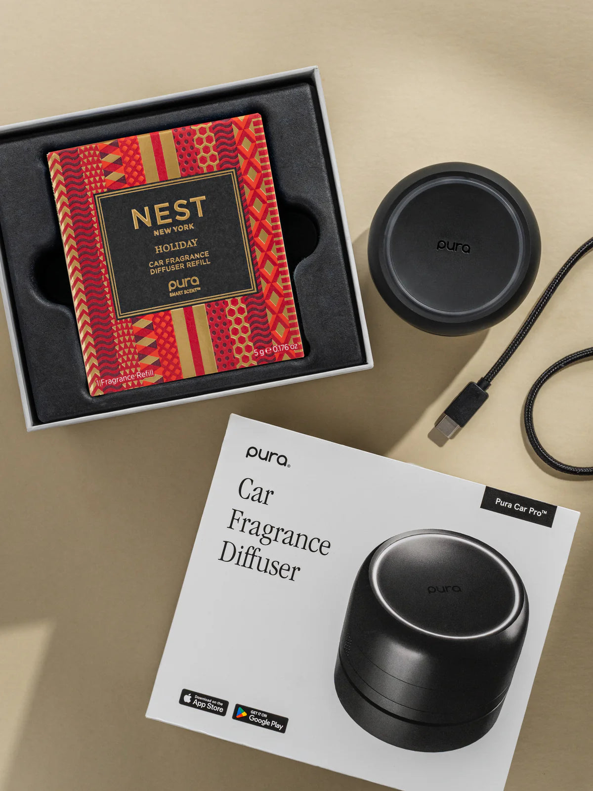 This set includes one NEST New York Holiday fragrance cartridge and a Pura Car Pro™ smart fragrance diffuser.