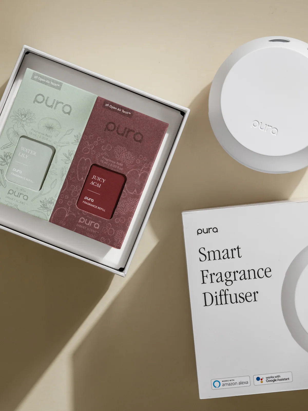 This set includes two premium Open Air Tech scents, Juicy Acai and Water Lily, and a Pura 4™ smart fragrance diffuser.
