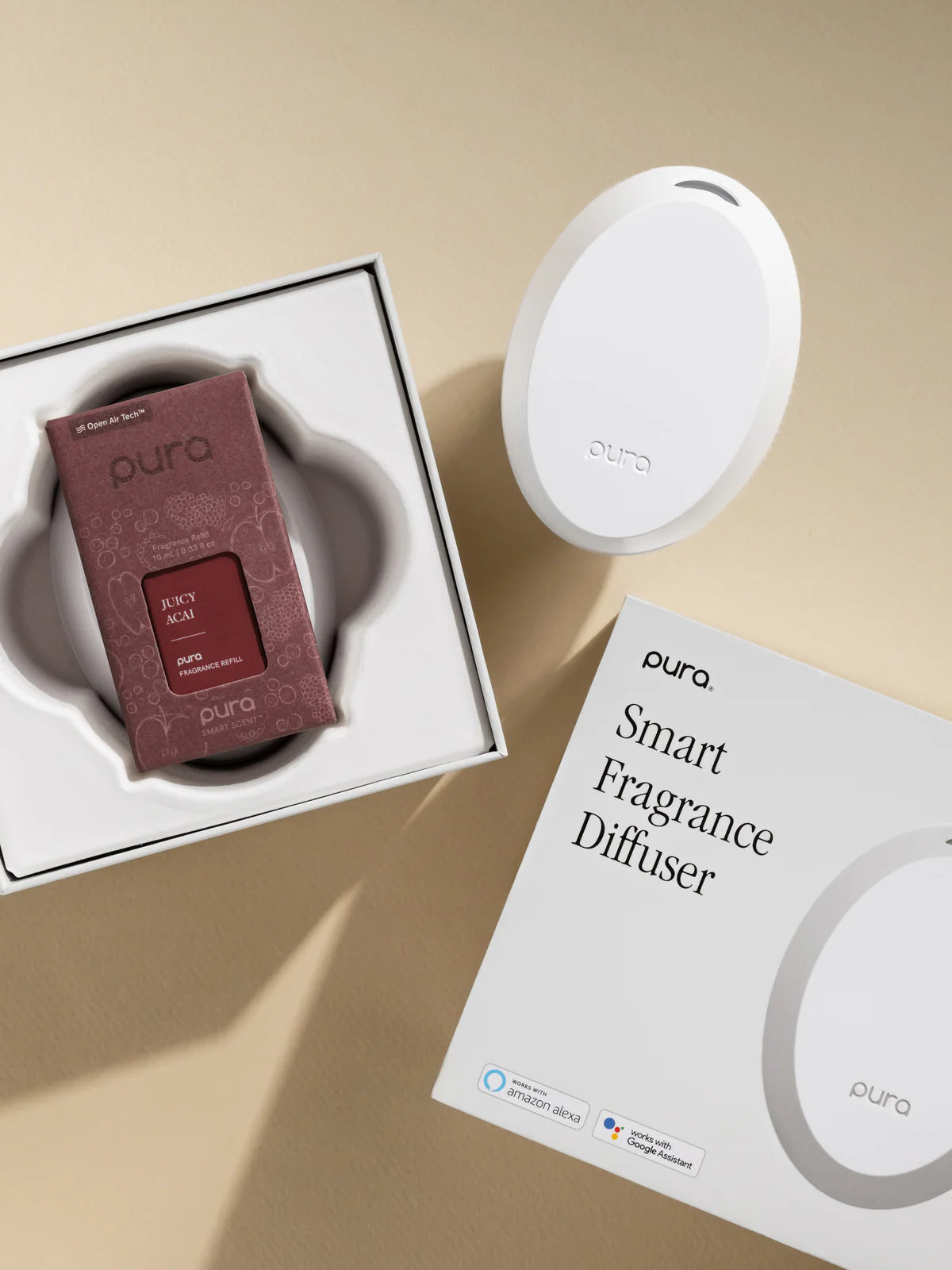 This set includes one Pura Juicy Acai fragrance vial and a Pura Mini™ smart home diffuser.