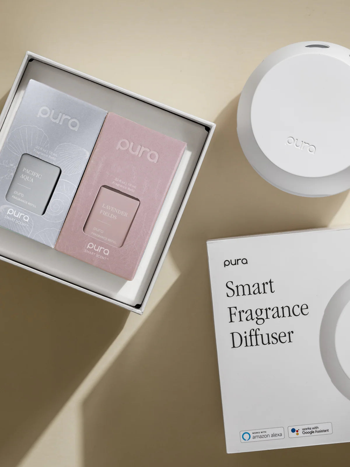 This set includes two premium Pura scents, Lavender Fields and Pacific Aqua, and a Pura 4™ smart fragrance diffuser.