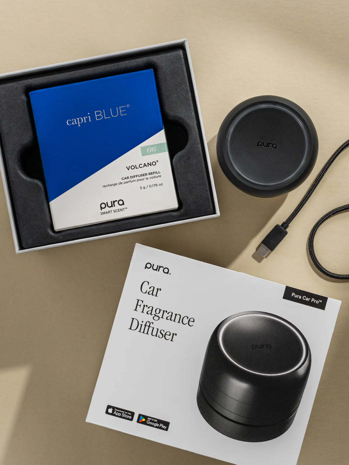 This set includes one Capri Blue Volcano fragrance cartridge and a Pura Car Pro™ smart fragrance diffuser.